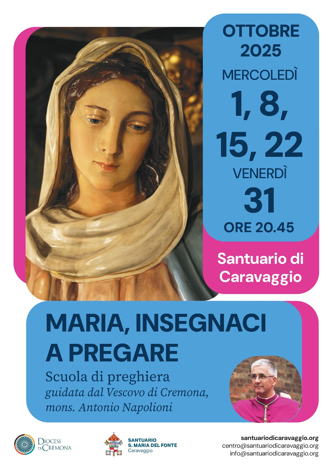 In questo mese di Ottobre – si concluderà con la serata di venerdì 31, vigilia di Ognissanti – il Santuario di S. Maria del Fonte presso Caravaggio ospita la “scuola di preghiera” presieduta dal Vescovo Napolioni. L’appuntamento settimanale, proposto a tutti i fedeli e alle Comunità, riprende il modello del percorso attuato lo scorso anno in Cattedrale a Cremona. Ma il luogo tanto caro alla devozione popolare e il profondo richiamo degli eventi qui accaduti, imprimeranno alla proposta un taglio particolare.